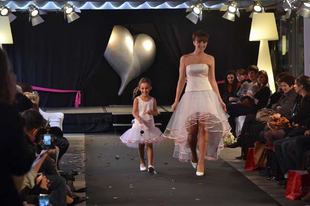 Une petite demoiselle d'honneur très remarquée accompagne une magnifique mariée en robes Charles.R au défilé très réussi organisé par les Galeries Lafayette au Radisson Blu à Blagnac.